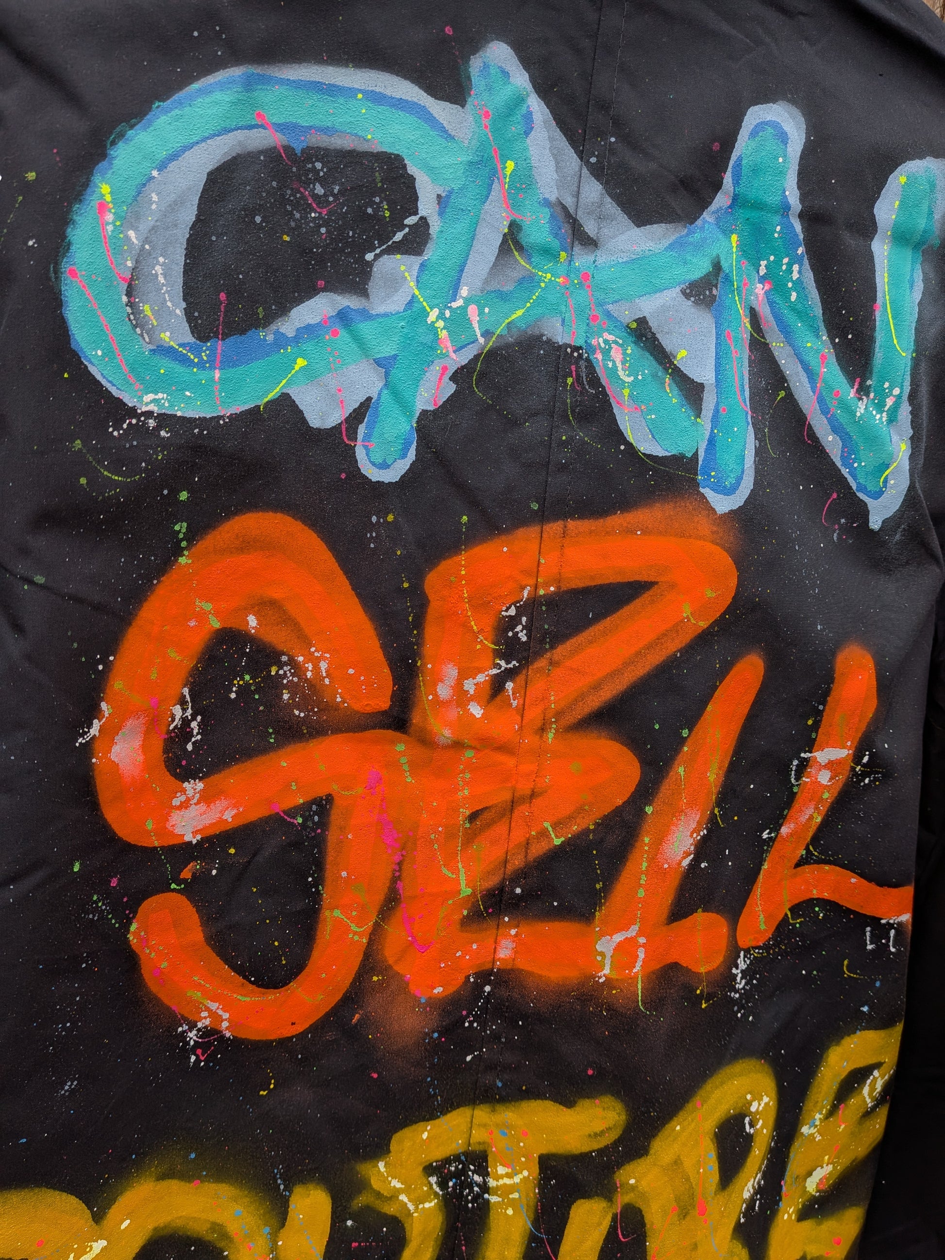 Preloved item turned into a piece of unique, wearable art by Core Sway using spray paint and paint pens direct to garment.